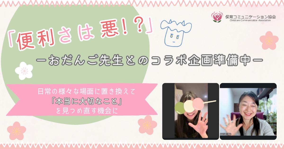 今回は、おだんご先生と一緒に「”便利”と”考える力”は両立しない~便利さは悪!? 保育の楽しさが主体性につながる」といった観点で、コラボ動画を準備しています。